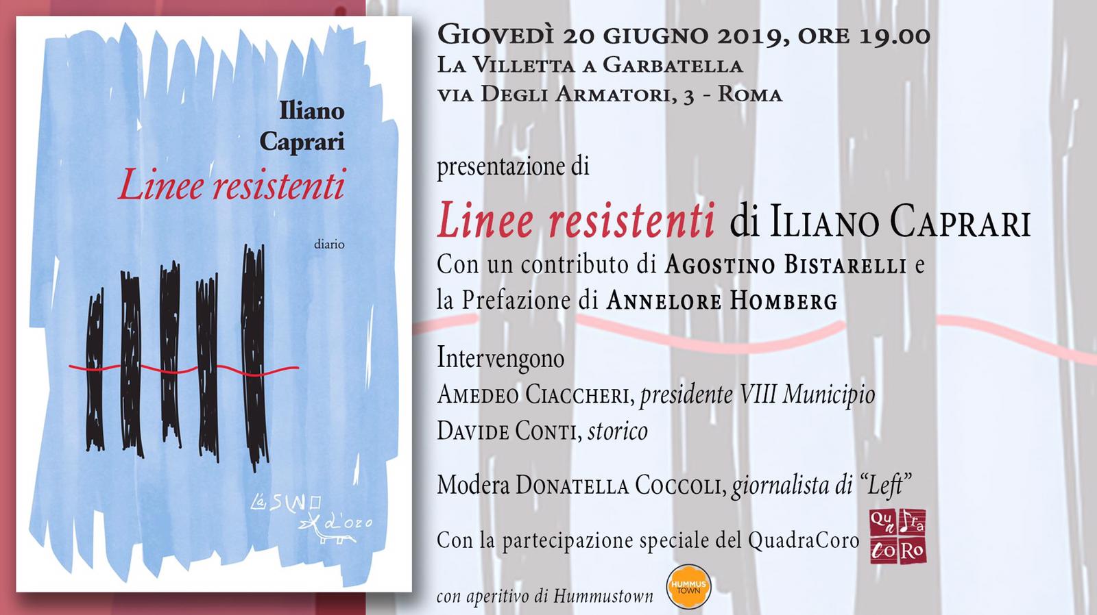 20 Giugno 2019 ore 19.00 Presentazione libro Linee Resistenti di Iliano Caprari edizioni L’Asino d’oro, presso La Villetta a Garbatella, con lo storico Davide Conti, il Presidente del VIII municipio Amedeo Ciaccheri e con la partecipazione del QuadraCoro